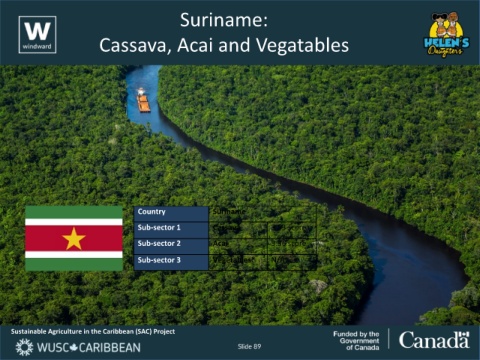 Suriname: Cassava, Acai and Vegatables Country Suriname Sub-sector 1 Cassava 3.53 score Sub-sector 2 Acai 3.36 score Sub-sector 3 Vegetables* N/A Sustainable Agriculture in the Caribbean (SAC) Project Slide 89